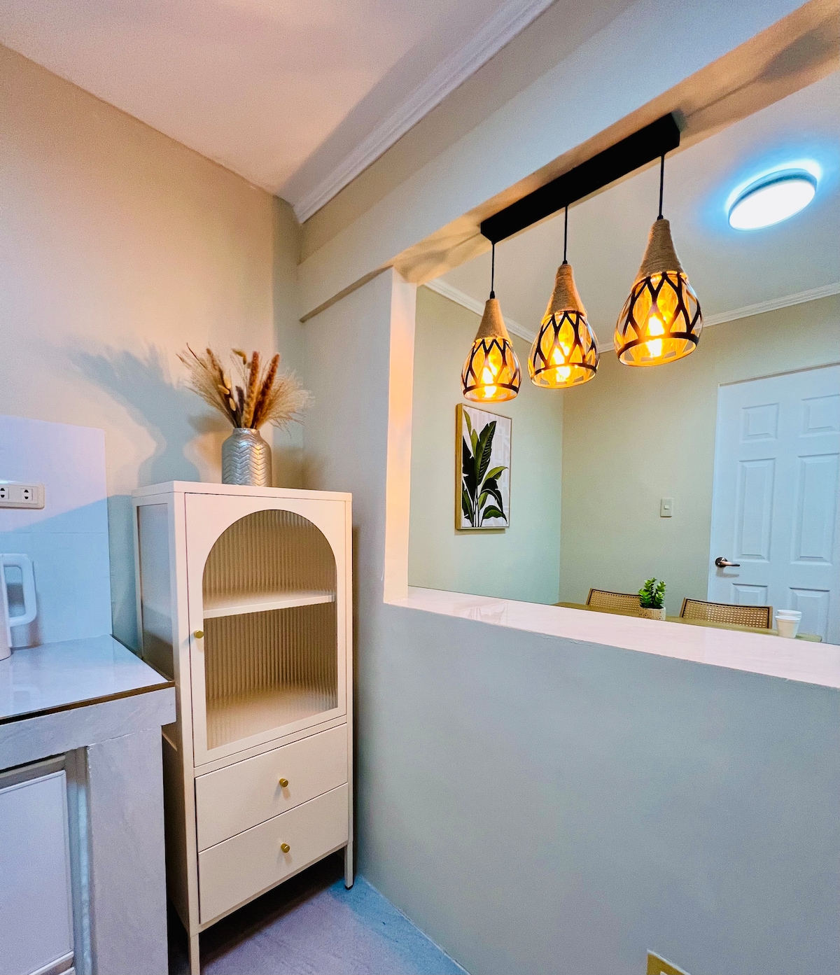 A haven for people who wants a staycation memorable with peaceful ambiance. It has a spacious and convertible bedroom with movable cabinet/division for a (two) 2 queen size bed. A Fully functional kitchen that is well lighted and ventilated where you can cook. With an 8cubic Fridge and a pantry cabinet for food: snacks, can goods, softdrinks available. • It's a fully airconditioned Haven with 2.5 HP Split type AC, plus 2 eletric fans for added air circulation • A clean bathroom with bidet etc