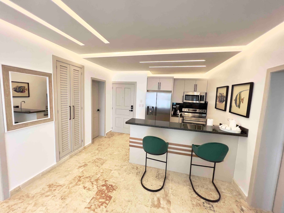 ¡Hermoso departamento de lujo, renovado, 2BR frente a la playa con un enorme balcón para cenar, con vistas al jardín, la piscina y Kite Beach! Baños de mármol, enfriador de vino, cocina completa, electrodomésticos nuevos. Ubicación exacta: Cabareef. Tómate un respiro largo y relajado y sumérgete en la mejor ubicación de Cabarete. Tranquilo, seguro y céntrico, pero a 2 minutos a pie de excelentes bares y restaurantes. Mi Mazda SUV 2019 en excelente estado disponible como extra por menos de los precios típicos.