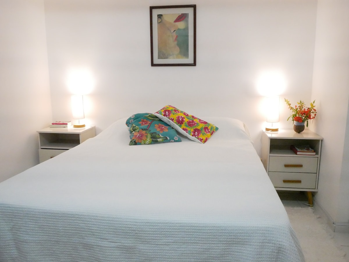 Wi-Fi gratuito y estacionamiento rotativo SmartTV LED 40" Comida y bebida: cocina americana con frigobar, microondas, cafetera y sandwichera Aire acondicionado Split Baño: baño privado con ducha, toallas. Comodidad: control climático, cama Queen ultra cómoda. No ofrecemos servicio de limpieza diario. Estadías largas, el servicio de limpieza se puede negociar antes de la reserva. Desayuno no incluido en la tarifa diaria*