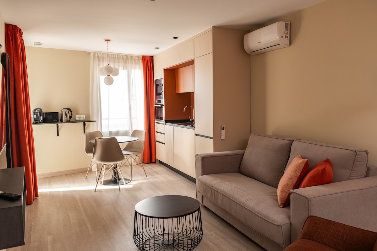Nuestro apartamento más luminoso y abierto, cuenta con un único gran espacio tipo estudio, equipado con aire acondicionado y todas las comodidades que buscas. En Altyn encontrarás una amplia estancia dividida en tres ambientes: zona de estar, cocina-comedor integrada con lavavajillas, horno, microondas y nevera grande y zona de dormitorio doble, cuenta con cuarto de baño completo con secador y una gran terraza-solarium en la azotea del edificio orientada al atardecer.