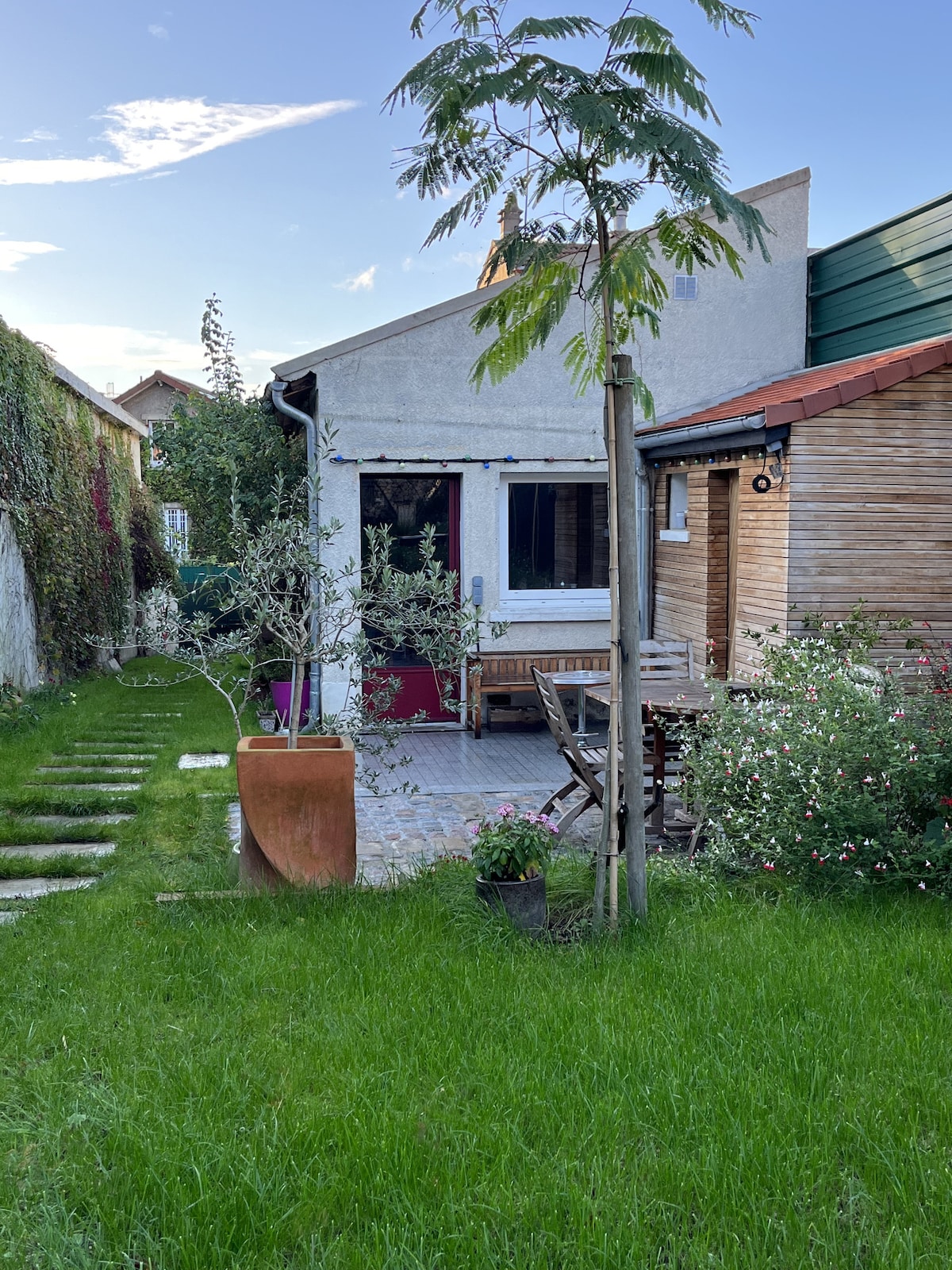 Tiny house de 30 m2 llena de encanto como una casa de campo a 15 minutos del centro de París. Situada en el fondo del jardín tranquilo, se encuentra a 3 minutos a pie del RER B Bagneux y de los comercios (supermercado, panadería). Reformada, incluye un cómodo sofá cama doble, una zona de cocina comedor, una zona de escritorio, un baño con ducha y un exterior privado en el jardín. Se proporcionan sábanas y toallas . Pequeño +: estufa 🔥 de leña para las noches acogedoras. Acceso al jardín compartido.