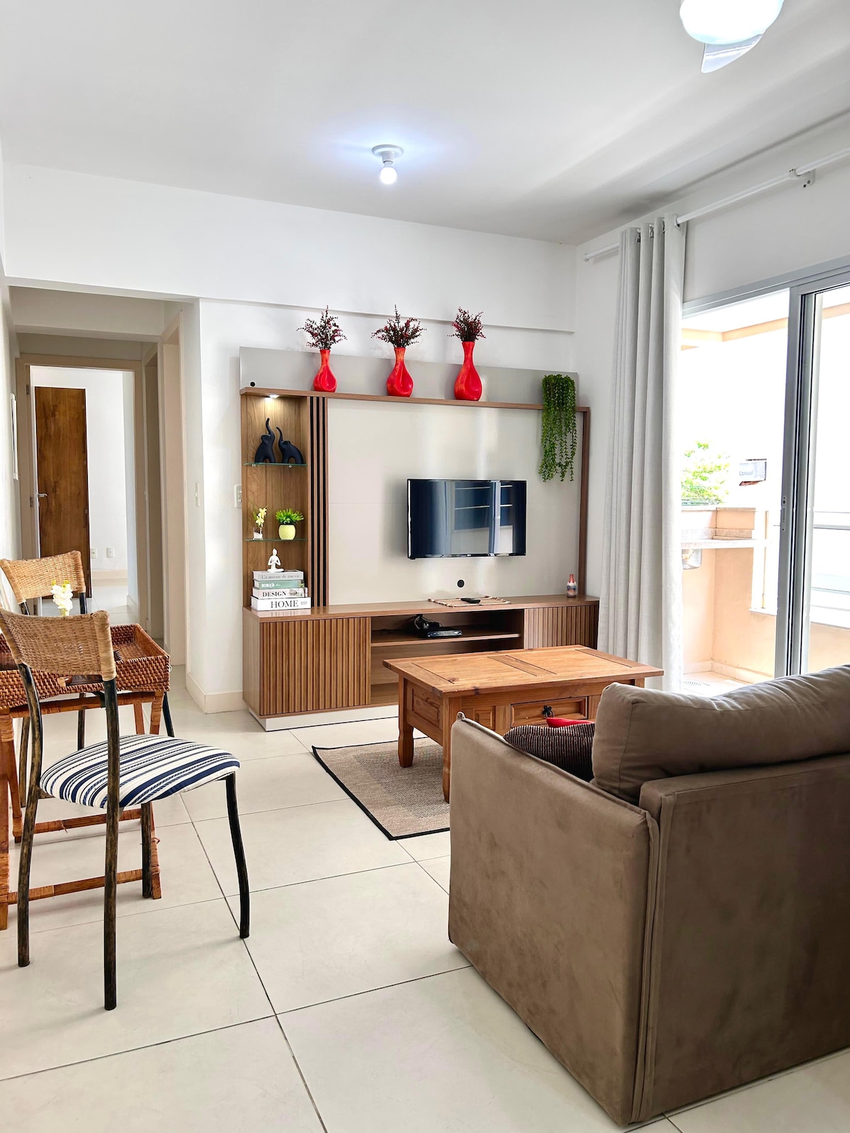 Precioso apartamento, amueblado, en el mejor condominio con piscina del sur del país - Marine Home Resort 1 dormitorio con suite con 1 cama doble y 1 cama individual, 1 baño, cocina, sala de estar, dos habitaciones, área de servicio, balcón con barbacoa. En la sala de estar hay 1 sofá cama súper cómodo y colchón inflable HABITACIONES CON AIRE ACONDICIONADO Wifi, televisor INTELIGENTE con NETFLIX en 2 TELEVISORES (IPTV) Cochera cubierta para 1 auto Condominio a 100m de la playa Cachoeira. Tiene un supermercado en la planta baja.