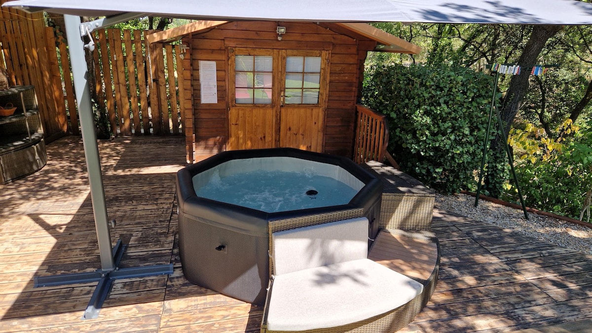 Entre Luberon et Durance, en campagne, joli cabanon de 70m² en bois avec piscine privative non chauffée , jardin et jacuzzi ouvert en hiver. Fbook: l'instant Luberon. Le cabanon dispose de: 2 chambres 16 et 12m², une cuisine aménagée/équipée, salle d'eau/WC, 1 salon avec 1 canapé convertible 2 places, 1 pièce espace détente avec jacuzzi ouvert l'hiver, jardin entièrement clos, grande terrasse et piscine privative .