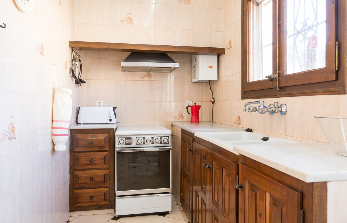 Casa de estilo ibicenco muy acogedora. 2 habitaciones, 1 baño con bañera en la segunda planta. Un baño, cocina americana, sala de estar con chimenea y terraza en la primera planta y garaje para utensilios con patio en la planta baja. Situada en una calle céntrica y tranquila en el barrio de Riells. A 350 metros de la playa y junto a todos los servicios, como supermercado, panadería, farmacia y entretenimiento para los niños. Zona muy familiar.