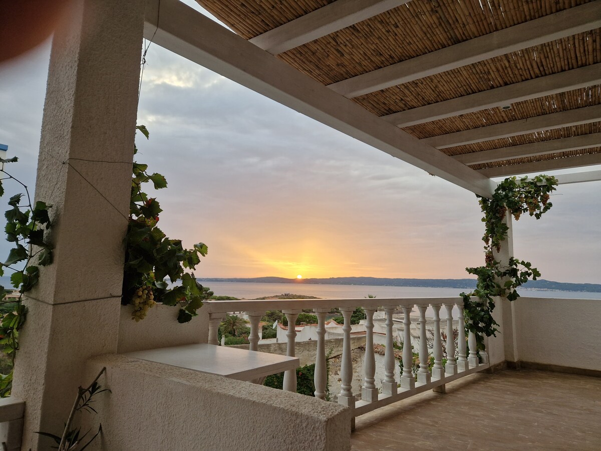 A tiro de piedra de la playa de Porto Pino, inmerso en los Pinos de Alepo de Cerdeña, alquilamos una villa independiente a 30 metros del mar accesible a través de una escalera privada. Acceso a la playa a 300 m IUN: P5466 CIN: IT111070C2000P5466 La casa: Sala de estar con terraza con vistas al mar, cocina, dormitorio doble, segundo dormitorio, baño, segunda terraza de barbacoa, estacionamiento privado y jardín (400 mq), ducha al aire libre. WIFI, ropa de cama y toallas incluidas