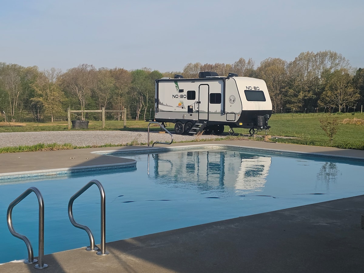Cabana with heated salt water pool, outdoor kitchen with hot water, refrigerator, freezer, Smart TV, WiFi, bar b que, fire pit with firewood, 2 ponds with bass, bluegill and catfish, canoes. Tent camping or 50 amp RV hookup also available. Close to Murray and Kentucky Lake. Pets allowed on leash. Nature walk. Flying D is a working horse ranch with Kiger Mustangs similar to "Spirit".