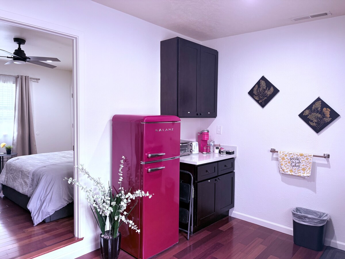 Nuestro bungalow en el patio trasero es un estudio de una habitación totalmente amueblado con baño completo. Tenemos una máquina de café, microondas y mininevera en el bungalow para nuestros huéspedes. La cómoda cama y el espacio de trabajo son perfectos para un viajero solitario o una pareja. Nuestro vecindario es urbano, pero tranquilo. Puedes * * escuchar a personas, vecinos, fiestas, música, autos, sirenas, trenes, pollos, personas sin hogar, etc.