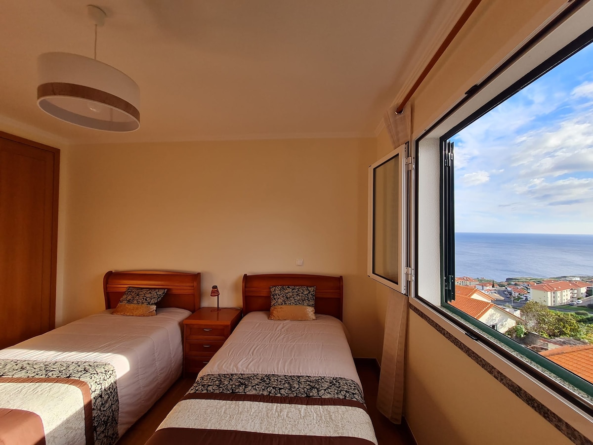Spacious and clean apartment with 2 bedrooms and 2 bathrooms, strategically located for day-trips and outside touristic and busy areas - Free private spot in garage - Early check-in available: depending on last Guest check-out time - Supermarkets, bars and restaurants around - Kitchen completely equipped to live in - Balcony with views over city/mountains, windows with views over ocean - Good for remote work (Wifi: 100MB) - Driving distances: 2min from highway, 5min beach, 10min airport/Funchal