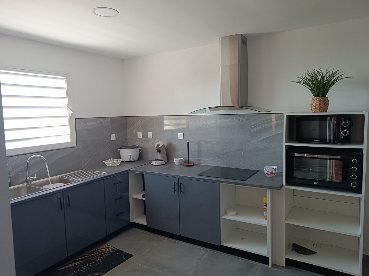 Nuestro bungalow, situado a 5 minutos del aeropuerto, está diseñado para ofrecerle una estancia relajante. Descubrirá un espacio luminoso y aireado con una cómoda habitación, una cocina totalmente equipada, un moderno baño y una terraza privada con jardín donde podrá relajarse escuchando el canto de los pájaros. Cerca de todos los servicios ( centros comerciales, cine, restaurante, farmacia, panadería, piscinas y cascadas), a 40 km de Salazie.