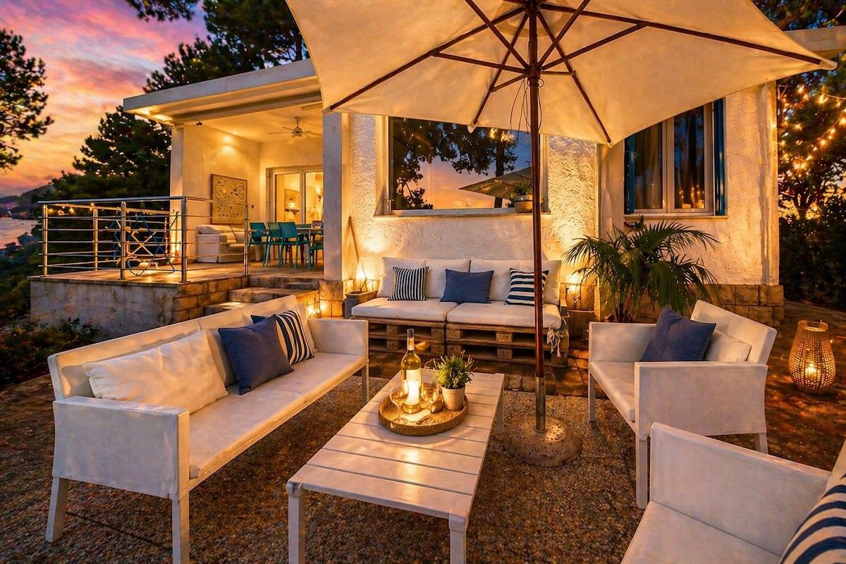 Villa con piscina privada grande, terraza con vistas al mar y barbacoa