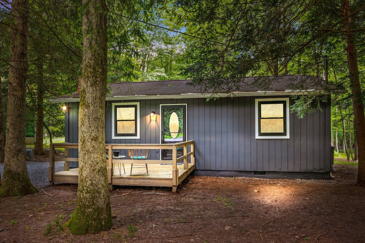 A pocos pasos del lago Harmony y restaurantes frente al lago. Incluye 2 tablas de paddle inflables. Alójate en esta cabaña actualizada de 2 camas/1ba con una terraza con vistas parciales al lago, barra de café y té completamente abastecida, chimenea/fogata (madera inc), barbacoa de propano, wifi, televisores inteligentes, juegos de mesa y más. Puedes comer algo en los restaurantes del otro lado del camino o cocinar en la cocina/barbacoa totalmente equipada de la cabaña. Acogedor hasta una fogata/chimenea por la noche. ¡Centralmente situado para explorar todo lo que los Poconos tienen que ofrecer!