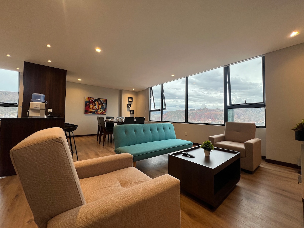 Despierta con la mejor vista de La Paz, en un espacio moderno y lleno de luz, perfecto para descansar o trabajar con comodidad 🌐 WiFi de alta velocidad 🛏️ 1 dormitorio con cama King con Smart TV 🛋️ Sala con sofá cama adicional y Smart TV 🍳 Cocina equipada 🧺 Lavadora y plancha 🚿 Baño completo con agua caliente 🏢 Ascensor en el edificio 🔒 Seguridad 24/7 🌆 Vista panorámica de la ciudad 🚗 Parqueo bajo solicitud (costo adicional) ¡Todo listo para que te sientas como en casa!