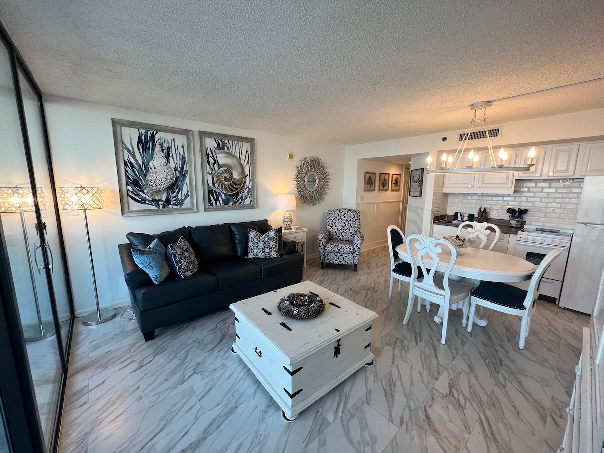 🌊 Escapada frente al mar | Recientemente renovado 2025 ¡Despiértate con el sonido de las olas y las vistas panorámicas del Atlántico desde tu balcón privado! Este moderno y elegante apartamento de 2 dormitorios en el corazón de Myrtle Beach cuenta con una decoración moderna, suelos de madera, sofá cama y colchones de primera calidad. Disfruta de una cocina completa, lavadora/secadora y servicios del resort: piscinas cubiertas/al aire libre, jacuzzi, río lento y zona infantil. A pocos pasos de Family Kingdom, el paseo marítimo y el muelle de la 2.ª avenida, ¡te espera una escapada costera perfecta!