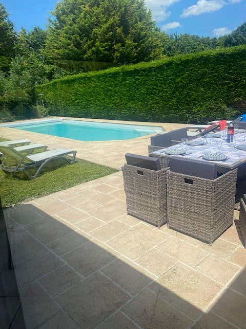 Studio 30m2, face à la nature avec terrasse & préau Le jardin & la piscine sont à partager avec nous. Une pièce de vie avec lit double, dressing, télévision, cuisine meublée et équipée, 2 feux, micro onde, cafetière, bouilloire et frigo. Une salle de bain avec douche et WC. EN OPTION Spa 5 pers, dont 2 allongées & 3 assises avec massage & jacuzzi 40€/jrs Petits déjeuner & Repas sur demande 10 à 20€ Garde ou sortie de votre animal de compagnie pendant votre absence si besoin 15 à 20€