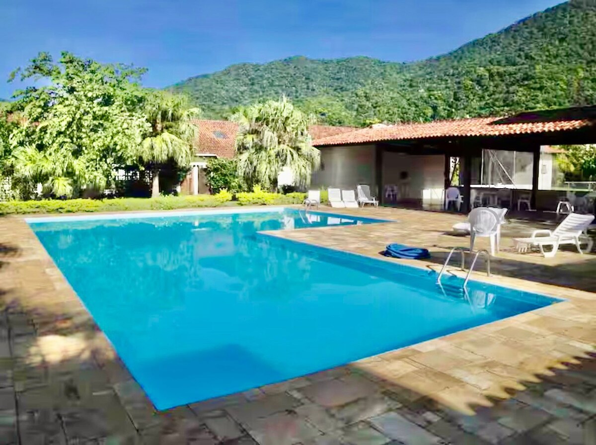 Casa con estilo y comodidad , suite de 5 estrellas (ducha de gas y bañera grande para dos con agua, aire acondicionado, ventilador de techo, colcha queen de calidad, sábanas de algodón de 400 hilos,TV, WiFi rápido: dos proveedores, balcón con red, vista al bosque atlántica y amplio armario. Para tu comodidad adicional: chimenea, cocina completa y quiosco-churrasqueira, piscina para dos sauna y río, todo privado. Jardín vallado para tu mascota. Condominio tranquilo, fácil acceso a las playas.
