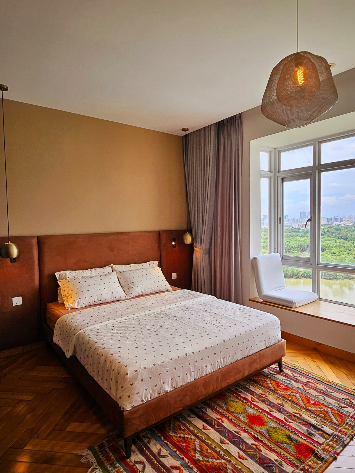 A stylish & comfortable apartment with balcony 85m2 at Hung Phuc Happy Residence located in the heart of district 7, Phu My Hung, with just a short walk to stores, mall, restaurants, and conveniences. Nearest bus stop in front. Highly educated and quite neighbors that surrounded by green parks and beautiful villas. Decorated in modern Japandi x Wabi sabi style with a focus on natural materials & clean lines. A great getaway or even staycation for those who want to experience new things.