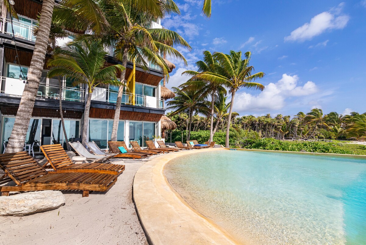Exclusive Family Beach house 50 feet sandy beach front, private pool, Classy modern, large spaces, high ceilings, fully air conditioned, Ocean view with private access to the beach, kayak , 4 rooms with balcony, TV room, Netflix, terrace with Bar & barbecue by the pool in front of the beach, terrace with ocean view. 5 blocks from Puerto Morelos main square, where you will find restaurants, Super market, shops, bars, masajes, Snorkel tours, etc... in front 600yds from the reef & México´s taste.