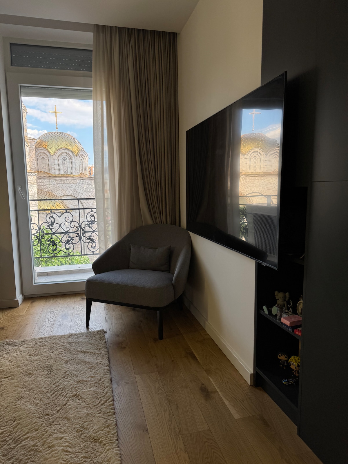 Modern 2-bedroom, 2-bath apartment in Skopje’s prime center with stunning balcony views of the Mother Teresa Museum and nearby church. Enjoy a spacious living room, full kitchen, elegant dining area, and cozy bedrooms. Perfect for couples or friends, with fun couples games included. Experience the vibrant city life right outside your door, then relax in stylish comfort. The perfect spot to explore, unwind, and make memories.