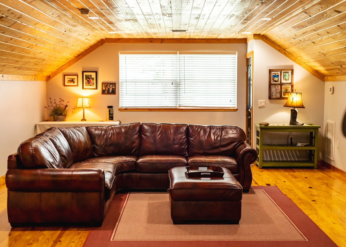 Hermosa estancia lejos de casa. Nuestro loft con cama tamaño king, ubicado en la parte superior de nuestro establo de hormigón para caballos, se encuentra en nuestro rancho Mini Moo de 30 acres en funcionamiento. Una vez que entres en nuestra unidad de acceso, hay una tranquilidad que viene junto con el espacio abierto y el aire fresco. La entrada del loft se encuentra en nuestro granero, donde arriba encontrarás la escapada perfecta. Suelos de madera, cocina gourmet, bañera con patas en el baño, etc. Nuestro albergue al aire libre ofrece vistas al campo, chimenea para noches frescas y parrilla.