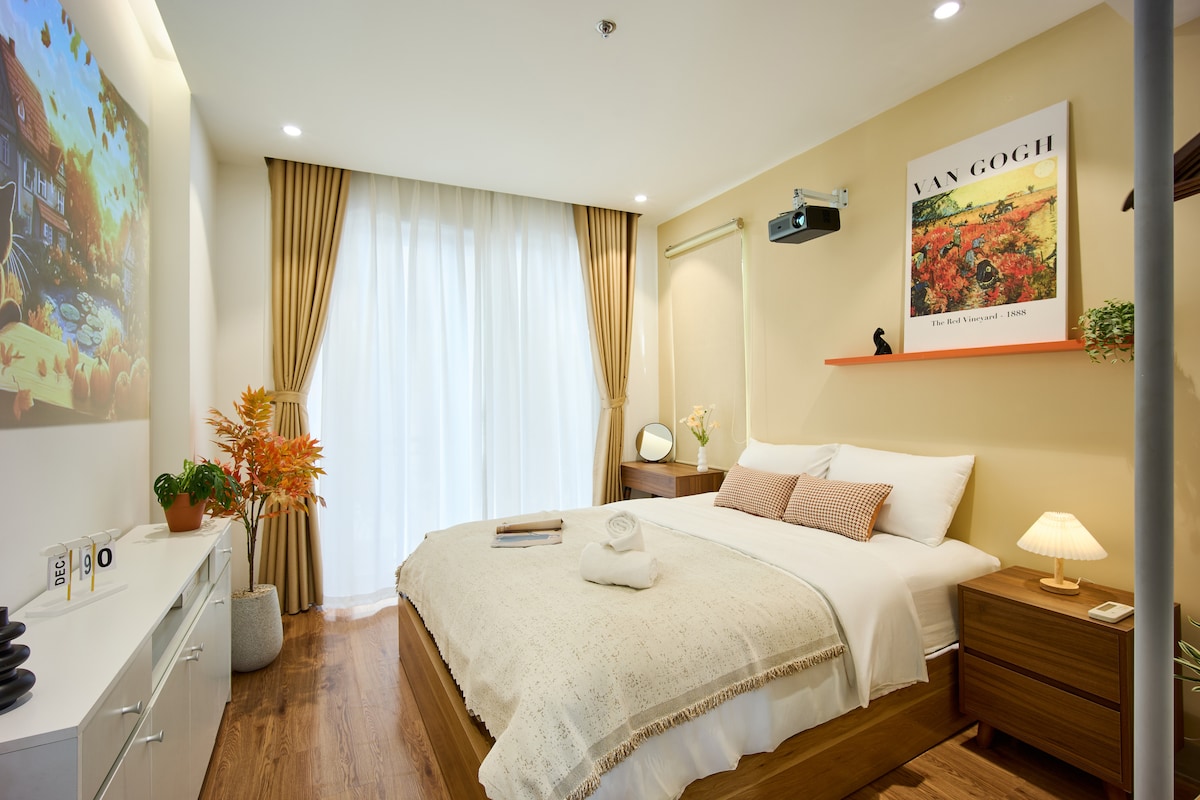 Autumn retreat — warm tones, soft textures, and cozy corners made for slow mornings & movie nights. Our 1BR is spacious w/ comfy sofa bed, and a full kitchen that you can whip up a meal before streaming Netflix on the 100-inch projector screen. Tucked in a quiet cul-de-sac by Han Market and just minutes from Dragon Bridge, it offers both city life and peace Clean, calm, and stylish — like golden hour captured in a room. Take the elevator up, drop your bags, and let Da Nang slow down for you.