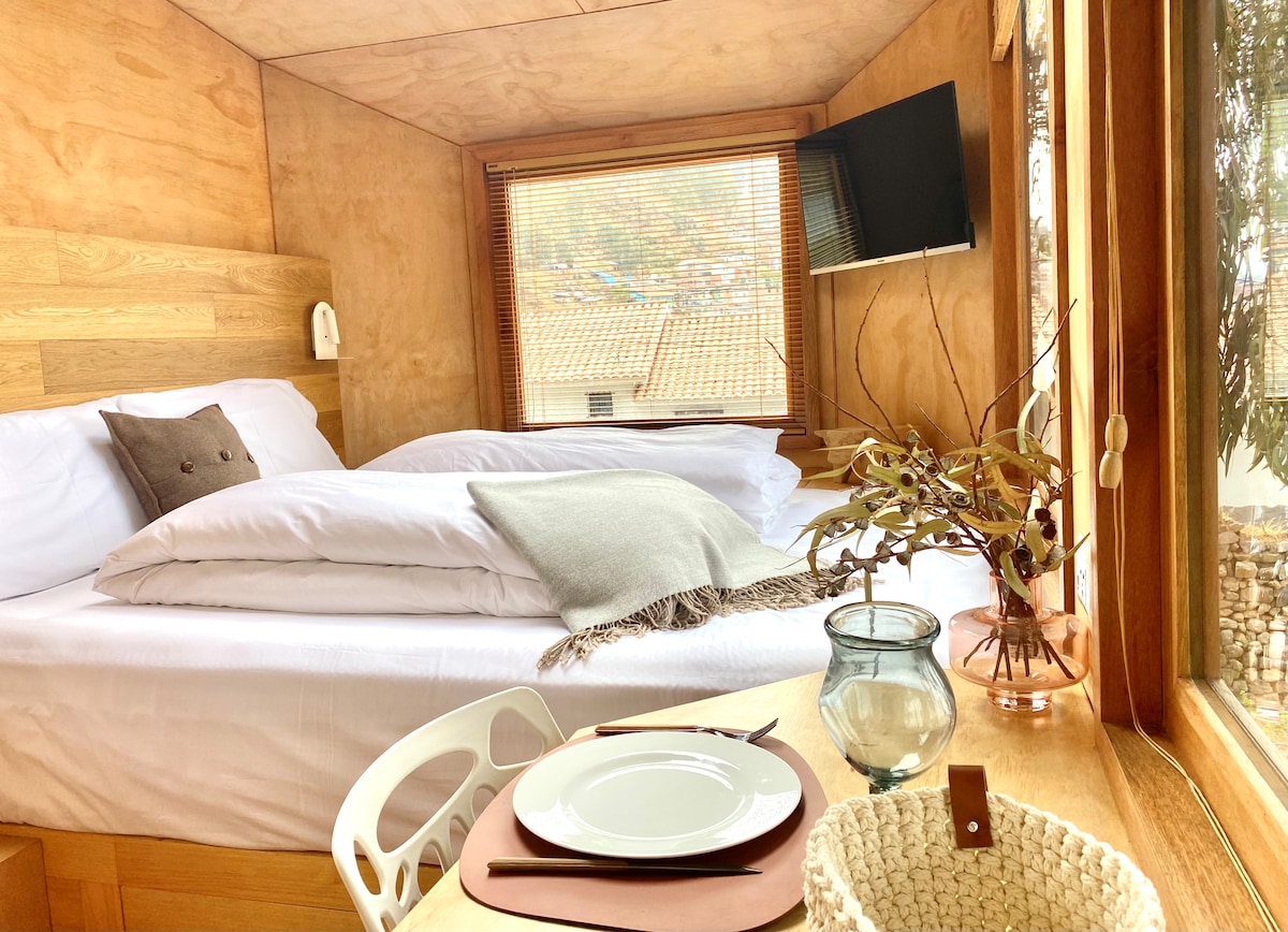 Descubre The Bull, una tiny house única, rodeada de eucaliptos y con vistas espectaculares del Cusco. Su arquitectura combina luz, calidez y diseño en perfecta armonía. Disfruta noches tranquilas junto al fuego mientras la ciudad brilla a tus pies y una ducha con techo de vidrio que te conecta con el cielo. Construida sobre tierras sagradas del linaje del Inca Manco Cápac, cerca de Sacsayhuamán y la Plaza de Armas. Reciclamos y compostamos, honrando el espíritu del lugar.