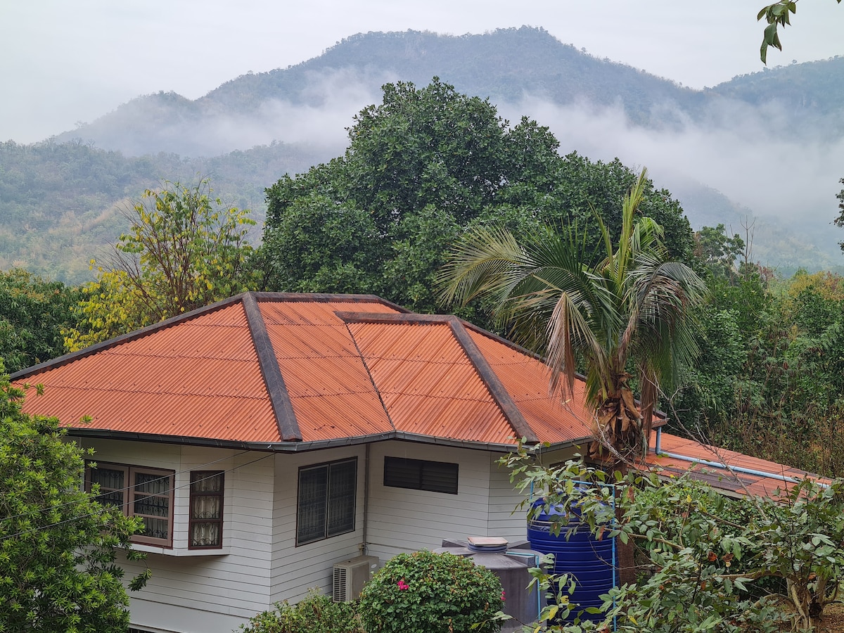 This 25-year-old house overlooks majestic mountains and features a spacious balcony with an outdoor cooking area. According to reviews, basic kitchen equipment is provided, allowing you to cook while enjoying stunning views and excellent air quality. It is located 2.5 hours from Bangkok and 50 minutes from Hua Hin. Driving a car is a convenient way to get around. If not, you can request a car with a driver for a daily fee. Cooking and learning Thai with the owner during a 1-week-long stay.