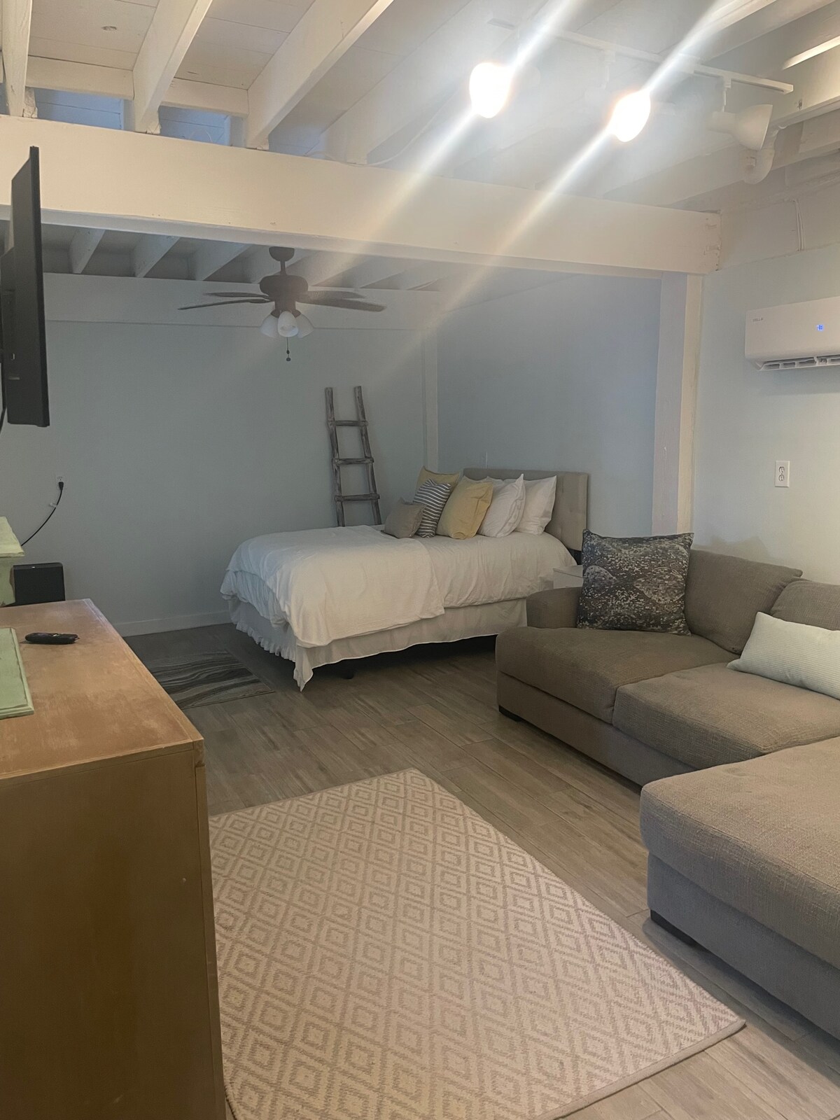 Actualización: siempre hemos proporcionado servicios de limpieza profesionales para limpiar cada habitación antes y después de cada huésped. Ahora estamos teniendo mucho cuidado de desinfectar tu espacio debido al coronavirus. Apartamento estudio totalmente amueblado con entrada privada (por encima del garaje independiente). Incluye una cama queen y un sofá cama emergente de tamaño completo. Cocina totalmente equipada (Keurig, sartenes, cubiertos y platos) Smart tv de 42pulgadas (Disney+,Netflix, Amazon Prime y hulu) con DVD y sonido estéreo.