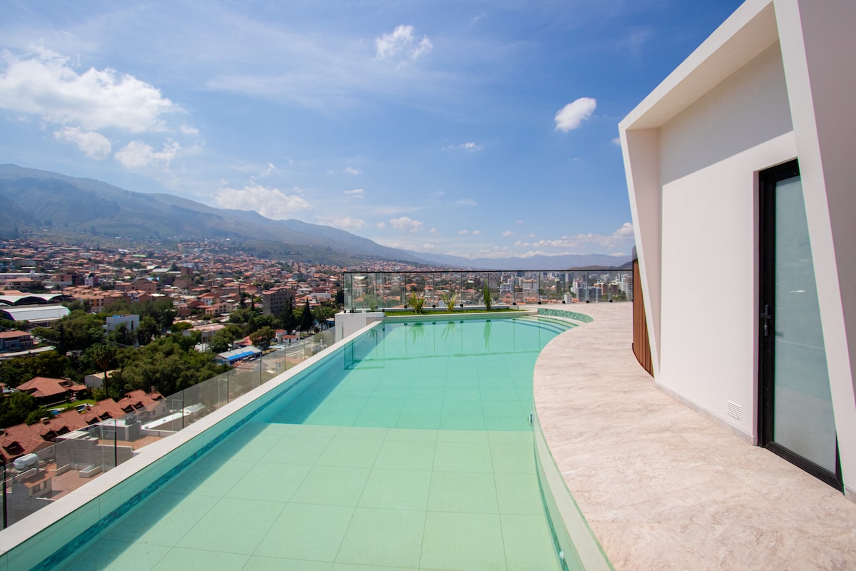 ¡Bienvenido y siéntete como en casa! Disfruta de LA MEJOR vista de Cochabamba desde el edifico mas alto de la ciudad y en la comodidad de un moderno departamento equipado con todo lo necesario para una estadía inolvidable. Relájate en un ambiente amplio, cómodo y acogedor de 1 habitación, ideal para un descanso reparador, con una hermosa terraza, WiFi de alta velocidad, cocina equipada para tus comidas y más. Perfecto para quienes buscan comodidad y estilo. ¡Te esperamos, reserva hoy!