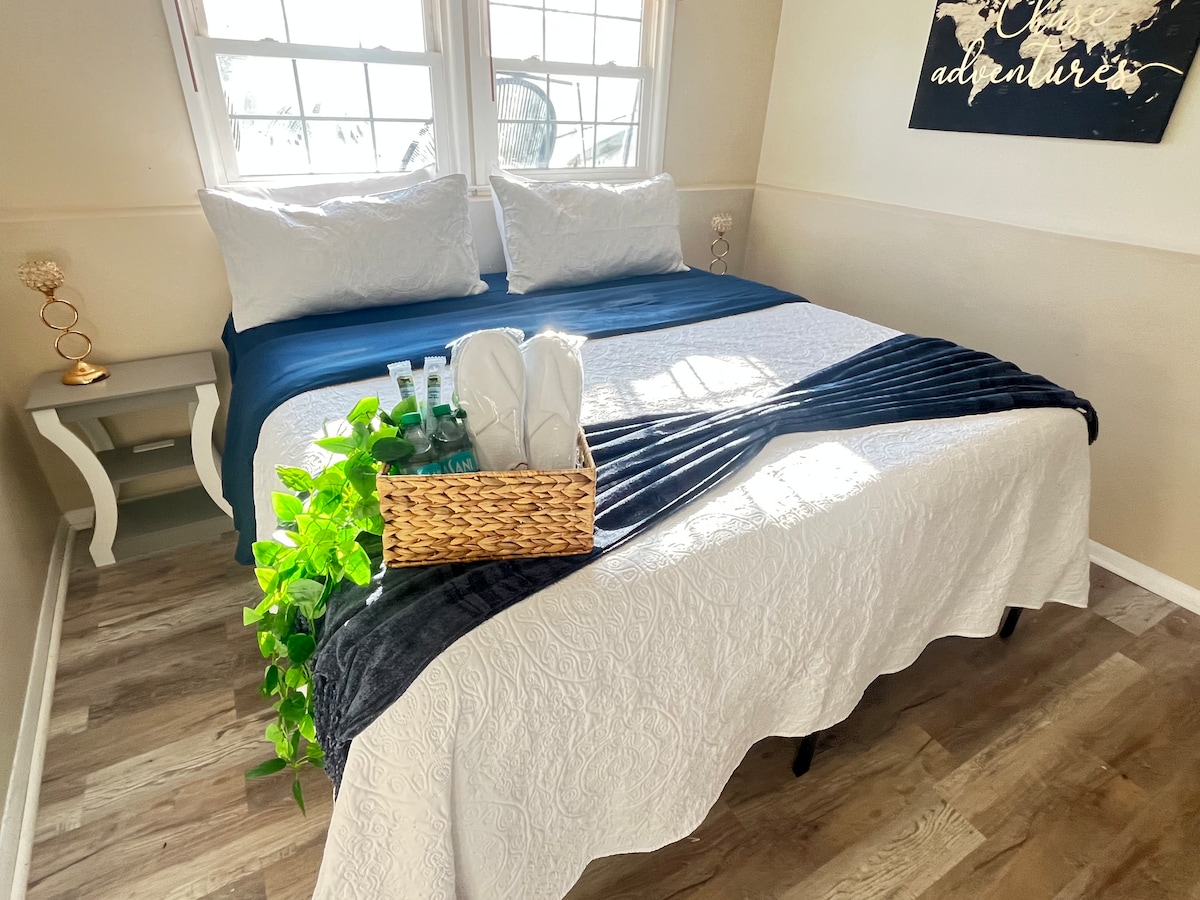 Relájate y desconecta con estilo. El porche cubierto te da la bienvenida con sillas de resorte de 1930, ventilador de techo y mesas de madera de algarroba hechas a partir de los cimientos originales. Para los amantes del baño, la bañera de hierro fundido de la década de 1930 (conocida por mantener el agua caliente) te llamará por tu nombre y te abrazará tan pronto como entres. La ducha de cascada, la ducha de mano y el grifo giratorio se adaptarán a todos los huéspedes. El dormitorio ofrece un colchón refrigerante, cama ajustable, iluminación ambiental, TV y almacenamiento adicional.