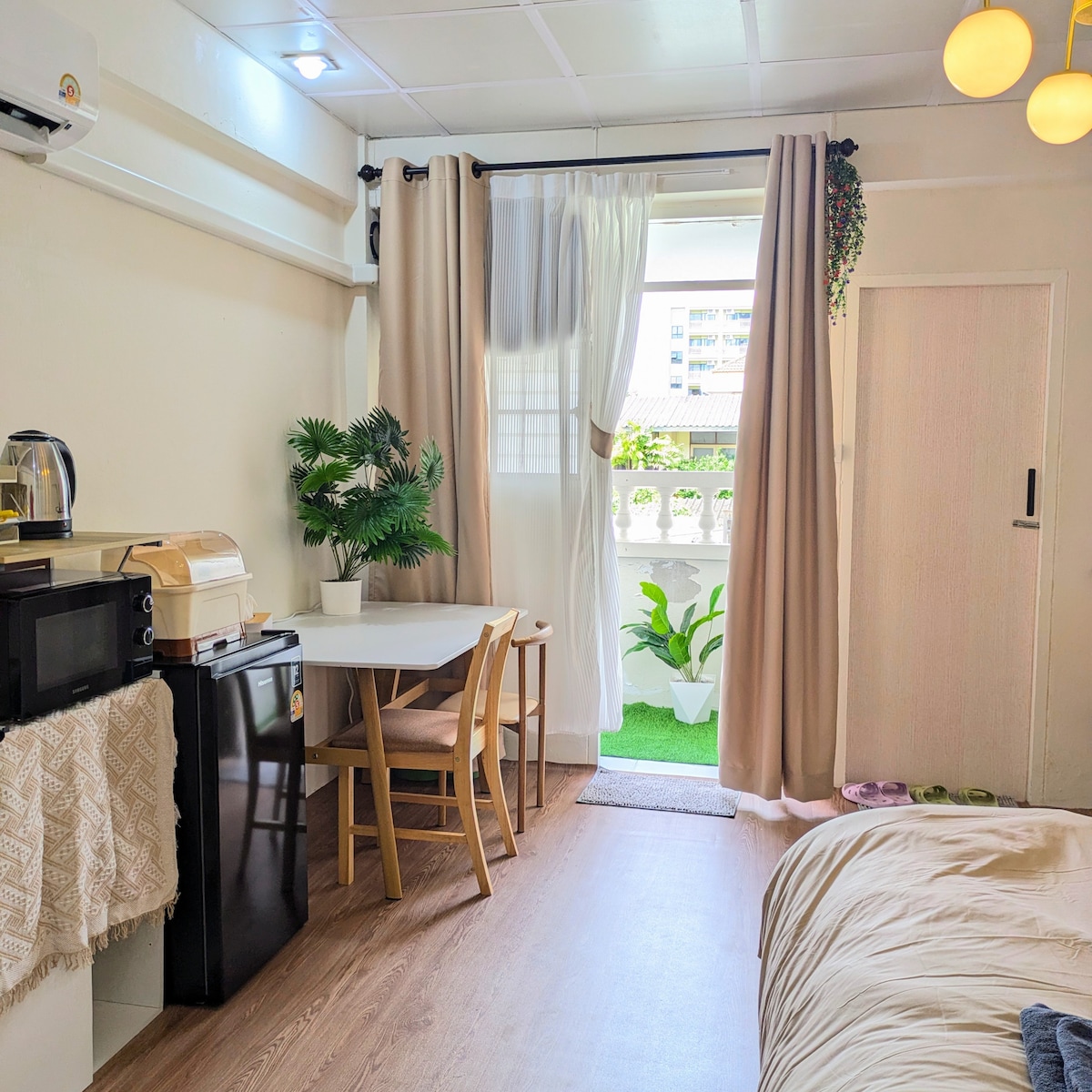 Una habitación tipo estudio recientemente renovada con 1 cama tamaño king supercómoda, baño privado, zona de minidespensa con microondas nevera. A solo 450 metros de BTS Sanam Pao y a 650 metros de BTS Ari. ** Lee las secciones «Otros aspectos destacables» y «Normas de la casa» antes de hacer una reserva :)
