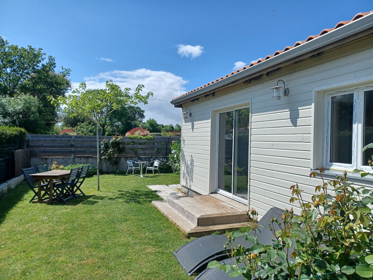 Jolie maison de plain pied, au calme et à 7 minutes des plages de Pornic, comprenant 3 chambres, une salle de bain, une cuisine ouverte sur salon et salle à manger. Un beau jardin clos de murs, avec Jacuzzi, grande terrasse avec barbecue, salon de jardin... de quoi passer de bons moments ... Électricité , Ménage et frais de linge à régler sur place. Thalasso pornic 15 min Aéroport de Nantes 35 min Planète sauvage 25 min Les machines de l’île Nantes 40 min Legendia parc 15 min Randonnée vélo