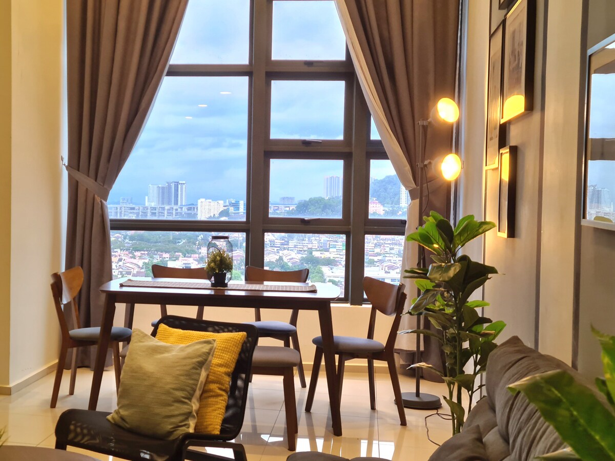 StarSuiteAC: ¡Alojamiento de lujo sobre las nubes! Un dúplex lujosamente diseñado en el piso alto, que ofrece una impresionante vista en la alfombra de las nubes del horizonte de Kuala Lumpur. ¡Relájate bajo el techo estrellado parecido a una galaxia y experimenta una escapada como ninguna otra! Disfruta de una sala de karaoke insonorizada, billar y hockey de aire, y un cine en casa con sonido envolvente para una verdadera experiencia cinematográfica. Instalaciones: cocina, nevera, microondas, olla arrocera, freidora de aire, filtro de agua, lavadora (con secadora), sillón de masaje, etc.