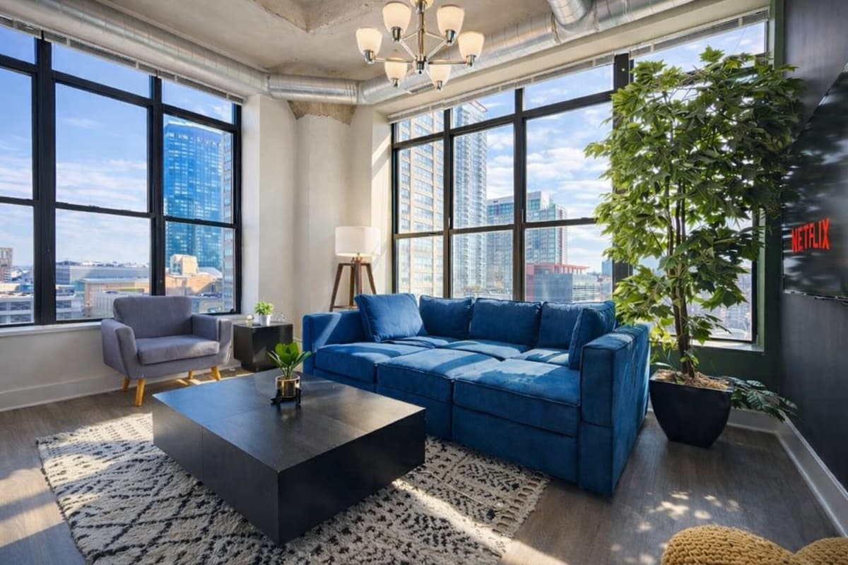 Disfruta de Chicago en nuestro moderno y espacioso loft de 1 dormitorio en el South Loop. ¡Ubicación céntrica para Grant Park, Soldier Field, Museum Campus, McCormick Place y mucho más! Nuestra ubicación tiene una puntuación de tránsito y paseo de 97, lo que proporciona un fácil acceso a todos los puntos de interés de tu itinerario. Disfruta de una encantadora luz natural, techos lujosamente altos y espacio para alojar a todo tu grupo. ¡Los huéspedes siempre se sorprenden gratamente por el tamaño del espacio y las comodidades modernas que ofrecemos!