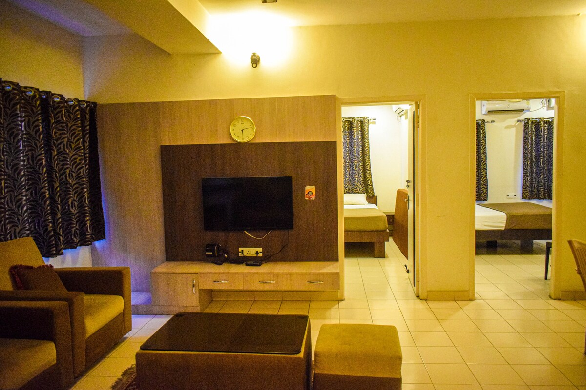 Te damos la bienvenida al apartamento 2 BHK en Aetheria Service Apartments, donde la comodidad y la comodidad se entrelazan a la perfección. Este alojamiento espacioso y bien equipado está diseñado para satisfacer las necesidades de los viajeros de negocios y de placer. La sala de estar decorada con buen gusto emana un ambiente cálido y acogedor, mientras que la cocina totalmente equipada permite la preparación de comidas sin esfuerzo. Los dos dormitorios están elegantemente amueblados, ofreciendo un refugio tranquilo después de un largo día de exploración.