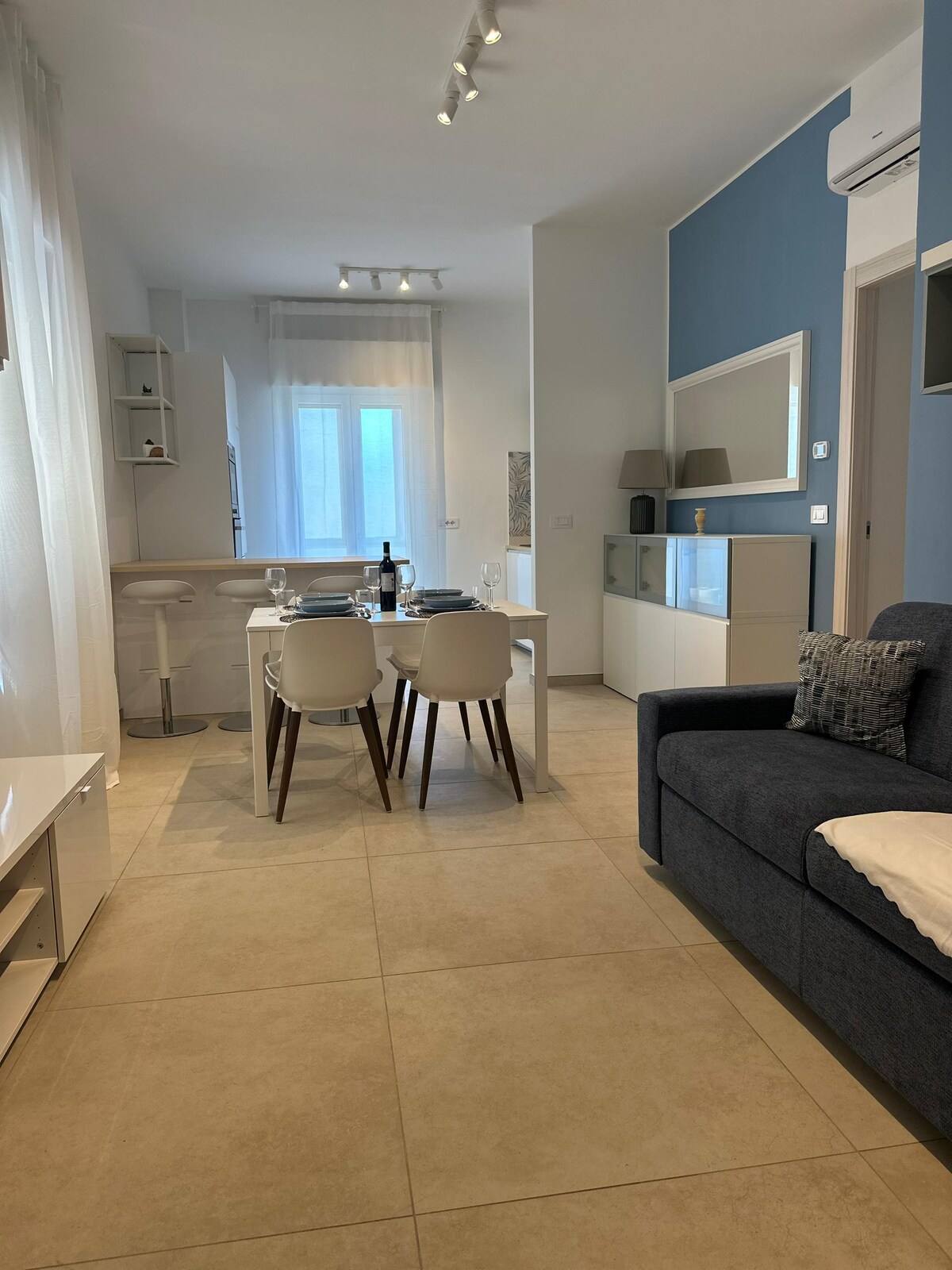 Appartamento moderno e luminoso, ristrutturato con arredi eleganti, situato al terzo piano con ascensore. A pochi passi dal centro, dalla stazione, dalla spiaggia e dal parco, offre tutti i comfort: aria condizionata, lavatrice e asciugatrice, cucina attrezzata e ampio soggiorno con divano letto. Dispone di una spaziosa camera da letto, uno studio con divano letto e un ampio terrazzo coperto e garage privato a pagamento. Ideale per chi cerca comfort e praticità in una posizione strategica.