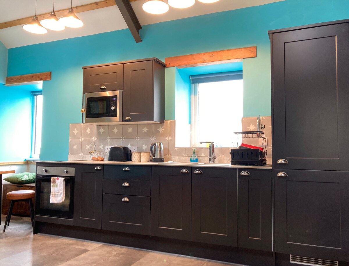 Stabl Y Felin es un establo reconvertido de grado 2, unido a un molino de maíz patrimonial, que ha sido restaurado con mucho mimo utilizando habilidades tradicionales y materiales y muebles sostenibles. Con sus techos de 4,5 m, el establo viene con un dormitorio espacioso con cama tamaño king, baño privado con ducha a ras de suelo, sala de estar con cocina americana recuperada y barra de desayuno, y un pajar con un futón tamaño king escondido en la parte superior para los valientes. Una escapada tranquila y rústica al pueblo en las colinas, a 4 millas de la costa.