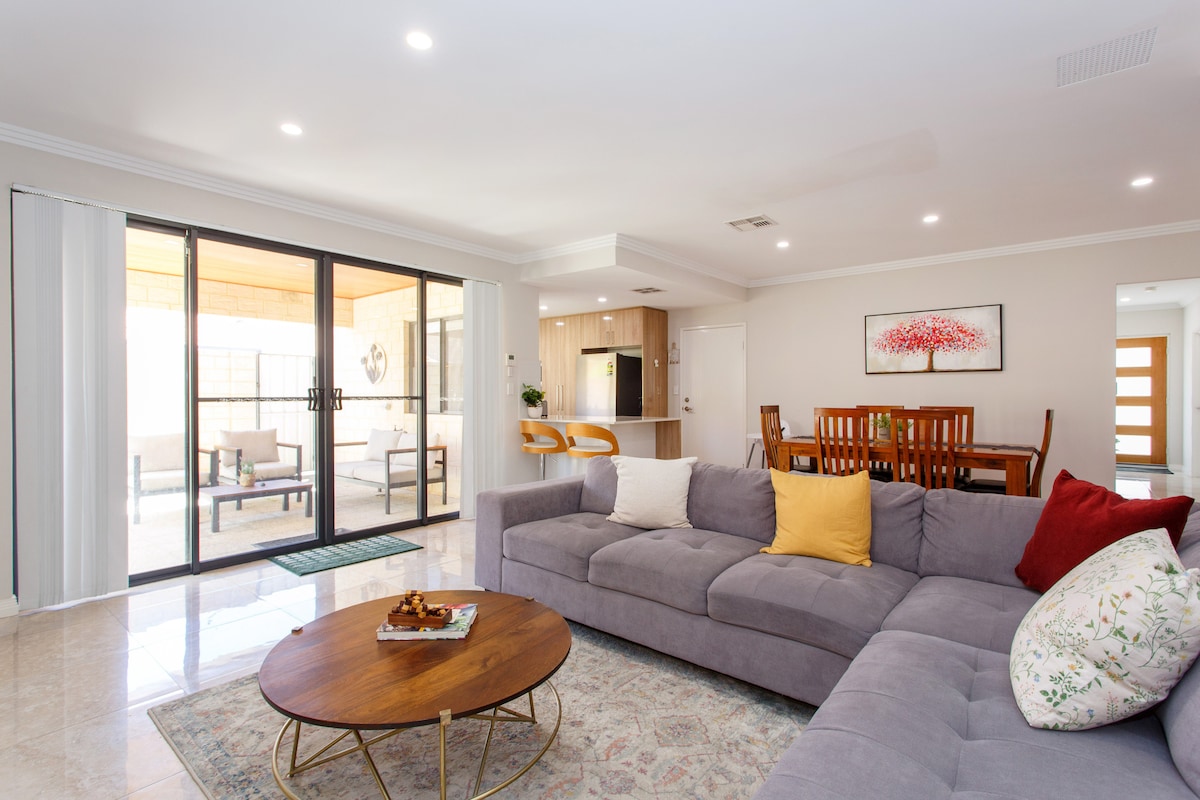 Luxury 4-bedroom villa sleeps 12 with 4 ensuite bathrooms, perfect for families or groups of friends. Enjoy city views, home theatre, trampoline, and modern living spaces. Minutes from the city, airport, beaches, and Swan Valley. Stylish, spacious, and full of fun — ideal for relaxing, entertaining, exploring, or celebrating. Comfort, adventure, and unforgettable memories all in one amazing home!