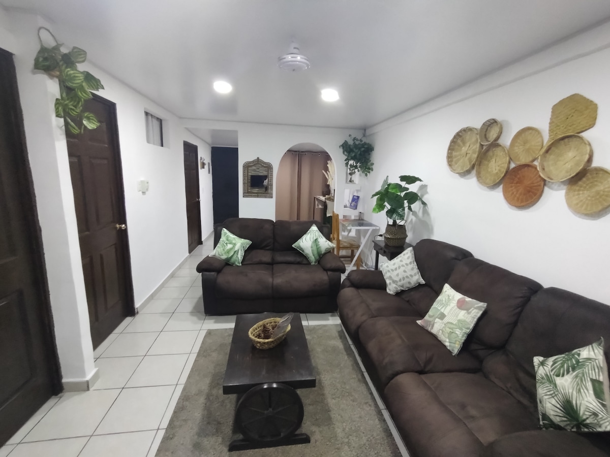 Cálido apartamento, con acceso independiente (Sin escaleras) Ubicación estratégica, para acceder a CComerciales, volcán, Centro Histórico, Biblioteca Nacional y playas. Concepto abierto y luminoso con finos detalles, donde coincide sala, comedor y cocina equipada. Con sofá cama (para un huésped adicional), 2 Smart TV, cable, wifi, agua caliente, aire acondicionado, lavadora/secadora, walk in closet y aréa de trabajo Diseñado especialmente para ti que buscas una comoda estadía.