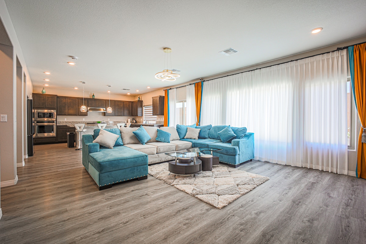 Disfruta de unas vacaciones en Cliffside, un refugio de 3 dormitorios y 3 baños en Mesquite. Esta casa de una sola planta cuenta con muebles de alta gama, una piscina de agua salada al aire libre de 19'x45' y jacuzzi, 3 televisores inteligentes, incluido un LG OLED de 77 pulgadas, e impresionantes vistas a la montaña. Mantente ocupado con juegos al aire libre, Xbox, juegos de mesa y rompecabezas. La cocina bien surtida te permite preparar tus alimentos favoritos y hay suficientes platos para servir a todo tu grupo. Combate el calor con aire central, ventanas sombreadas y cortinas opacas.