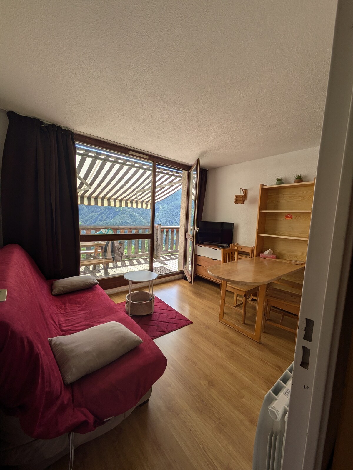 Apartamento de 28 m2 muy luminoso, con balcón y vistas abiertas al valle de la fuente del Verdon. Wifi 15 MB/s Varias salidas de senderismo a la vuelta de la esquina El departamento se compone de: - Una habitación con cama doble 140x190 - Cocina equipada - Zona de comedor - Sala de estar con 1 sofá convertible 140x190 - Baño con bañera - WC separado El complejo ofrece además: - Piscina climatizada (abierta del 1 de julio al 31 de agosto) y tumbonas