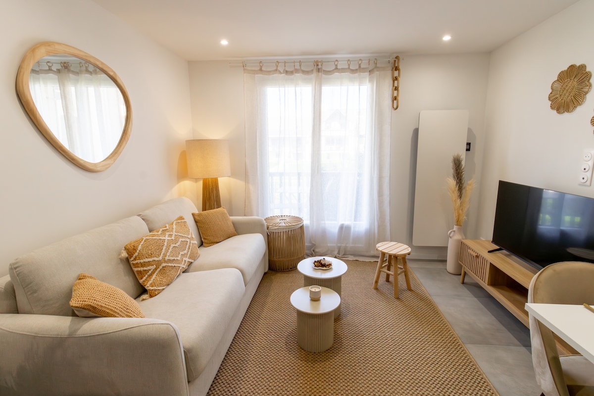 Joli F2 refait à neuf avec terrasse et jardin à 50m de la plage, accès direct au club de voile, location de paddle.. piste cyclable pour longer les plages du débarquement et rejoindre la ville de Caen par le canal. Très proche supermarché et nombreux commerces de proximité (lavomatique, cordonnerie...) sans oublier le casino, la thalasso et son spa accessible à la journée, centre équestre etc... En voiture : 15min de Caen, 2h00 de Paris. Arrêt de bus à proximité.