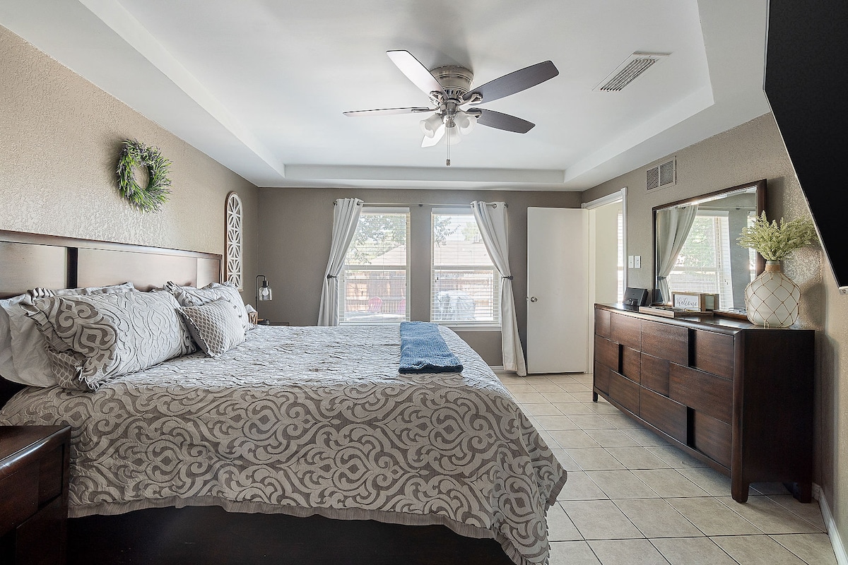 ¡Te damos la bienvenida a nuestro lujoso Airbnb para familias! Nuestro alojamiento cuenta con todos los servicios que necesitas para disfrutar de una escapada cómoda y agradable con tus seres queridos. Mira películas y programas de televisión en la enorme pantalla de 85 pulgadas, relájate en el jacuzzi o juega en el patio trasero cubierto de hierba. Incluso tenemos un acogedor rincón de lectura para momentos tranquilos. Ubicado cerca de Legacy West, The Star, RoughRiders Baseball y muchos centros comerciales, nunca te faltarán cosas que hacer. ¡Reserva tu alojamiento hoy mismo y empieza a planificar tus mejores vacaciones!