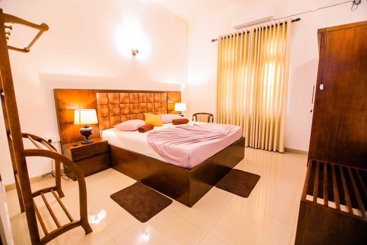 Grand home for vacations, reunions, events in Colombo suburb. Unique indoor outdoor space. Sleeping accommodation for 5 couples 5 bedrooms. Full-time caretaker and chef for Srilankan food. Cannot cook inside home - avoid spices. Can rent only one room in the main house, whole main house or only the guest house or all five bed-rooms. Guest number based fees. 500$ a day fee outside guests for events or gathering. Bedroom based fees. Absolutely no pets. No cooking inside house.