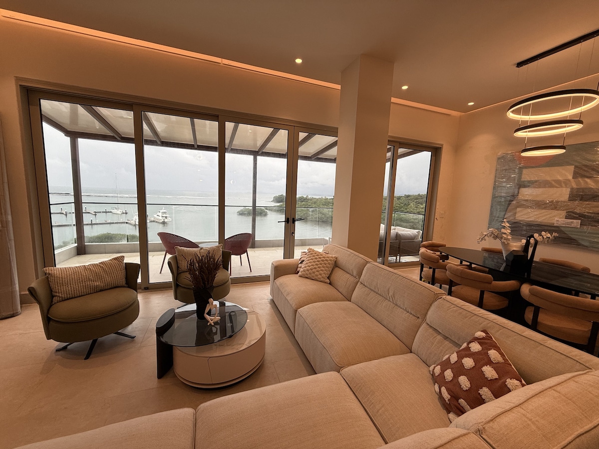 • Moderno condominio de 3 dormitorios/3 baños con vistas al mar y al puerto deportivo y un patio de entretenimiento para cenar • Cocina totalmente equipada y elegante sala de estar con televisor inteligente grande e iluminación LED ambiental • BR1: cama tamaño king, TV de 55", baño privado, cabecera personalizada y acabados en madera cálida • BR2: cama tamaño queen, smart TV, pared con mandala, paleta neutra suave • BR3: habitación infantil con 4 literas individuales, escritorio, TV, vista verde • Diseño contemporáneo de lujo, muebles empotrados, persianas opacas, sábanas de algodón de bambú de lujo