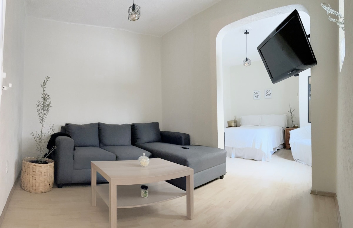 Bienvenido a nuestro acogedor y moderno apartamento en la Colonia Del Valle. Ubicado en uno de los barrios más populares, a 2 cuadras del World Trade Center Nuestro apartamento cuenta con 1 habitación equipada con todo lo necesario para una estancia confortable. La sala de estar es espaciosa, con amplios ventanales y una cocina equipada. Para tu comodidad, el apartamento cuenta con Wi-Fi de alta velocidad y televisión por cable. Esperamos darte la bienvenida pronto a nuestro alojamiento.