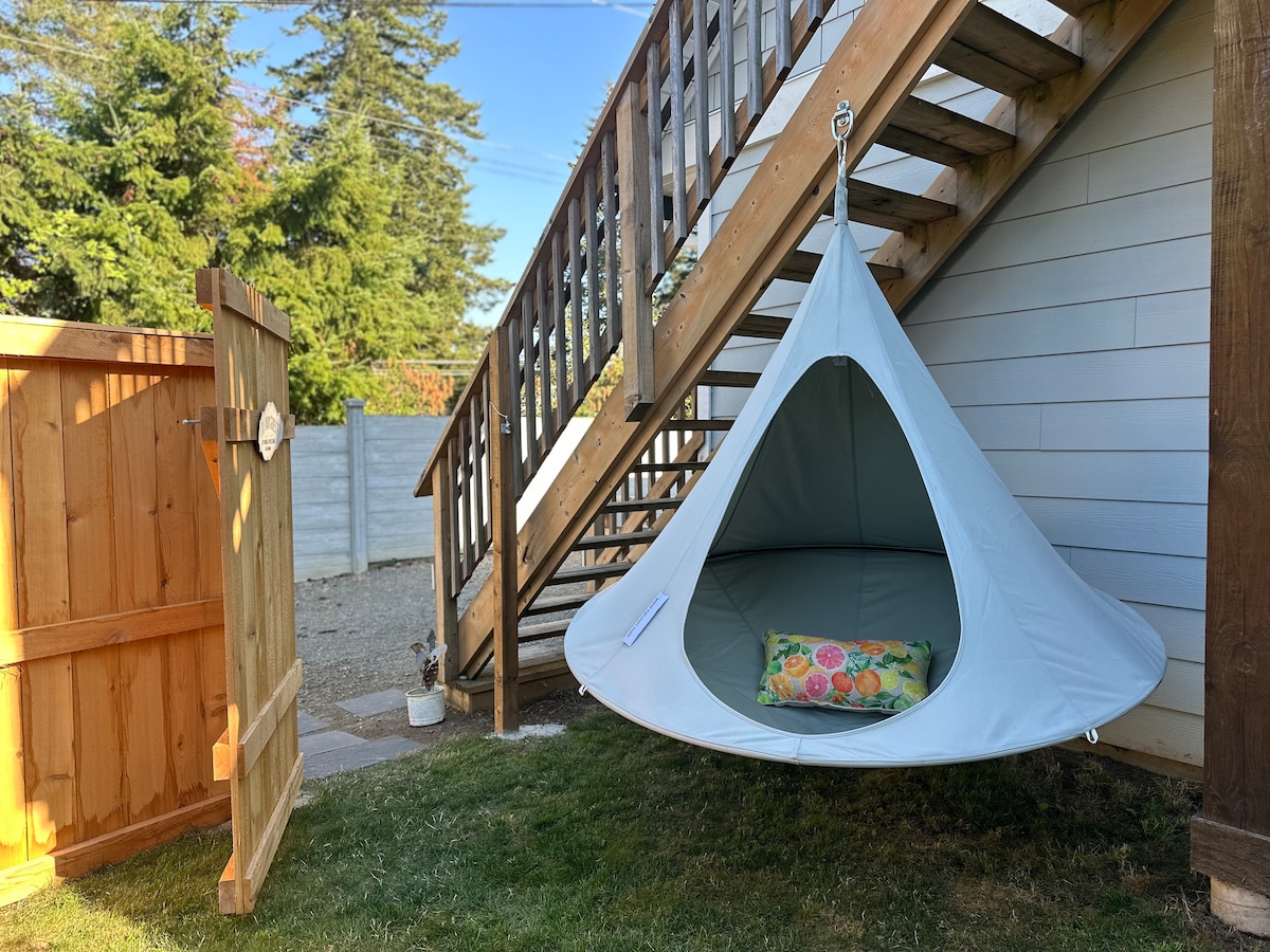 Unwind in the double soaker hot tub under twinkling lights, connect by the fire, or cuddle up in the cocoon hammock as the sun dips. Enjoy the welcome basket, bikes for two, and our raved online guidebook packed with local suggestions + more! Steps from golf courses • 5 minute drive to downtown, beaches, trails, wineries & breweries • 30 minutes to Mount Washington 3 minutes to Comox Airport, 5 to the ferry. Secure storage onsite. Your dream getaway awaits ✅ Registration: H7518222901