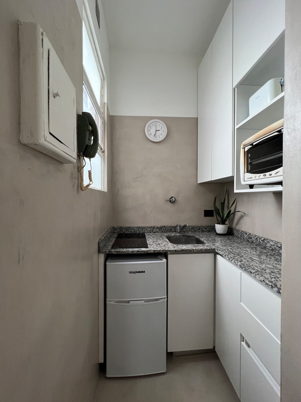 De Alvear Studio Retiro hará tu estadía en Buenos Aires mucho más placentera y agradable gracias a su ubicación estratégica en el barrio de Retiro y al confort que ofrece con su diseño y equipamiento moderno. En sus 28m² cuenta con todo lo necesario para un descanso cómodo y reconfortante. Netflix, wifi, split frío/calor, mini-bar, utensilios de cocina, cama Queen, ropa de cama, toalla y toallones, bata de baño, secador de pelo, anafe eléctrico, cafetera, tostadora, pava electrica y mucho más.