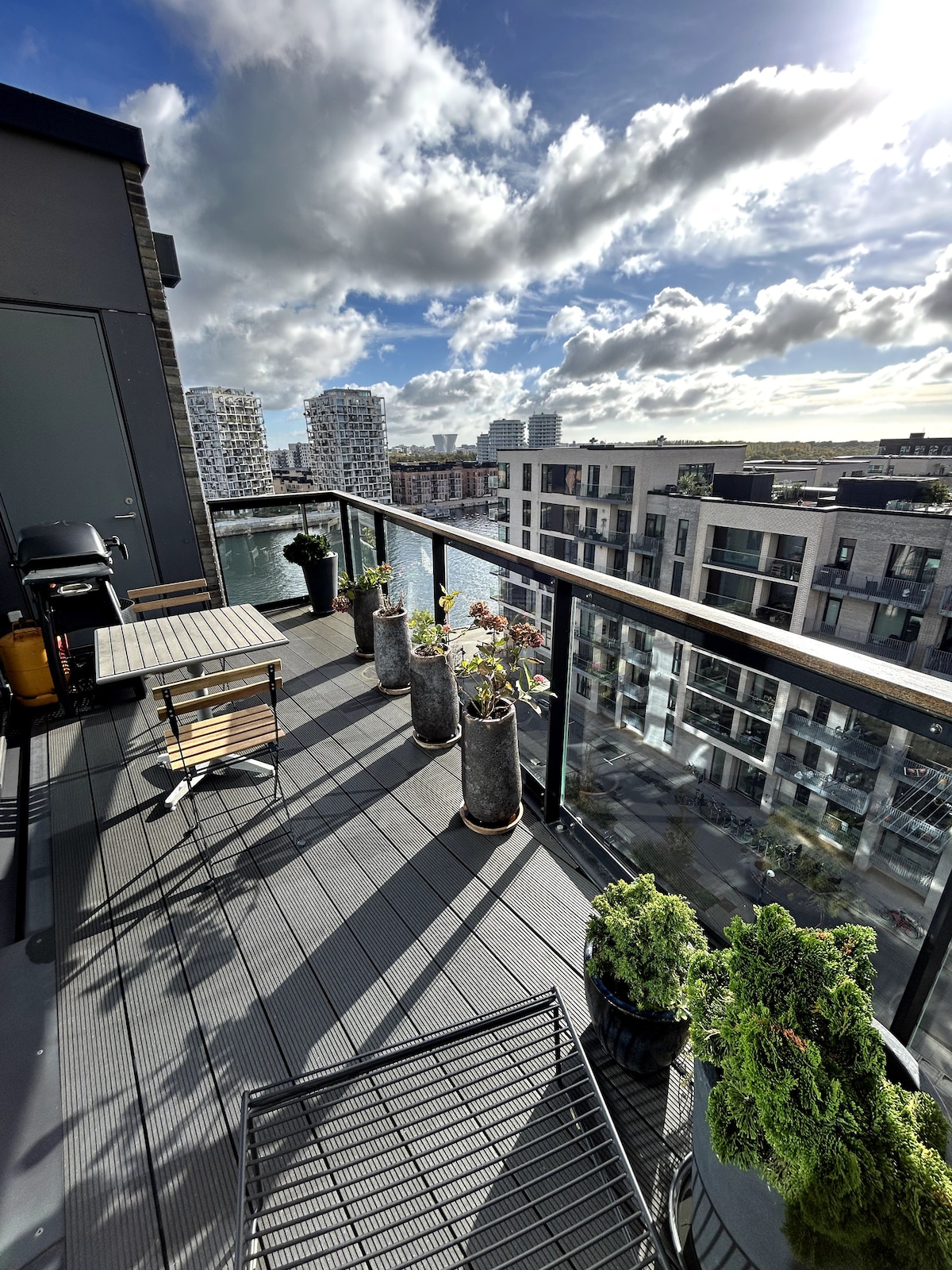 Spacious sunny modern flat on the 10th floor of the beautifully renovated Wennberg Silo, a former storage silo converted in 2004 into a residential property by the award-winning architect Tage Lyneborg. Free parking at the building. Shared 230 sqm roof terrace. Boat-bus to Nyhavn and city center at the doorstep. One big livingroom with a kitchen corner, terrace facing S-W and canal. Bedroom with a queen-size bed. Extra-comfort 140x200 seeping-sofa in the living room. You can swim in the canal!