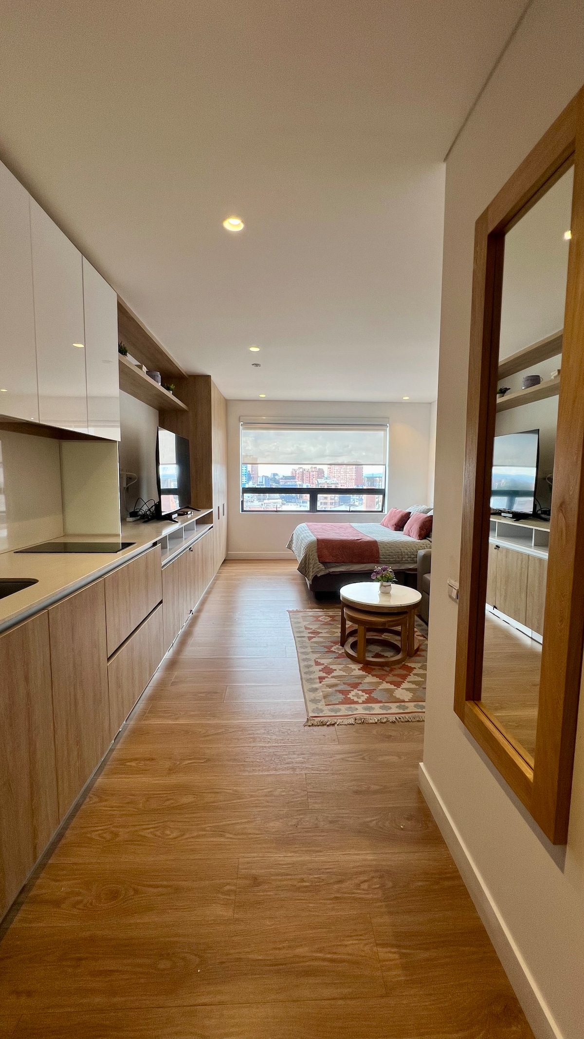 Moderno aparta-estudio en Teusaquillo, a pasos de Corferias. Aprox 6 min en carro de la Embajada de EE. UU., 8 min de la Universidad Nacional y a 10 min del estadio El Campín (los tiempos pueden variar según el tráfico de la ciudad). Ideal para trabajo o turismo. Cama queen, sofá cama, Smart TV, wifi rápido, cocina equipada y baño privado. Edificio con coworking, gimnasio, yoga, juegos, seguridad 24/7 y check-in autónomo. Sin parqueadero propio (opciones cercanas).