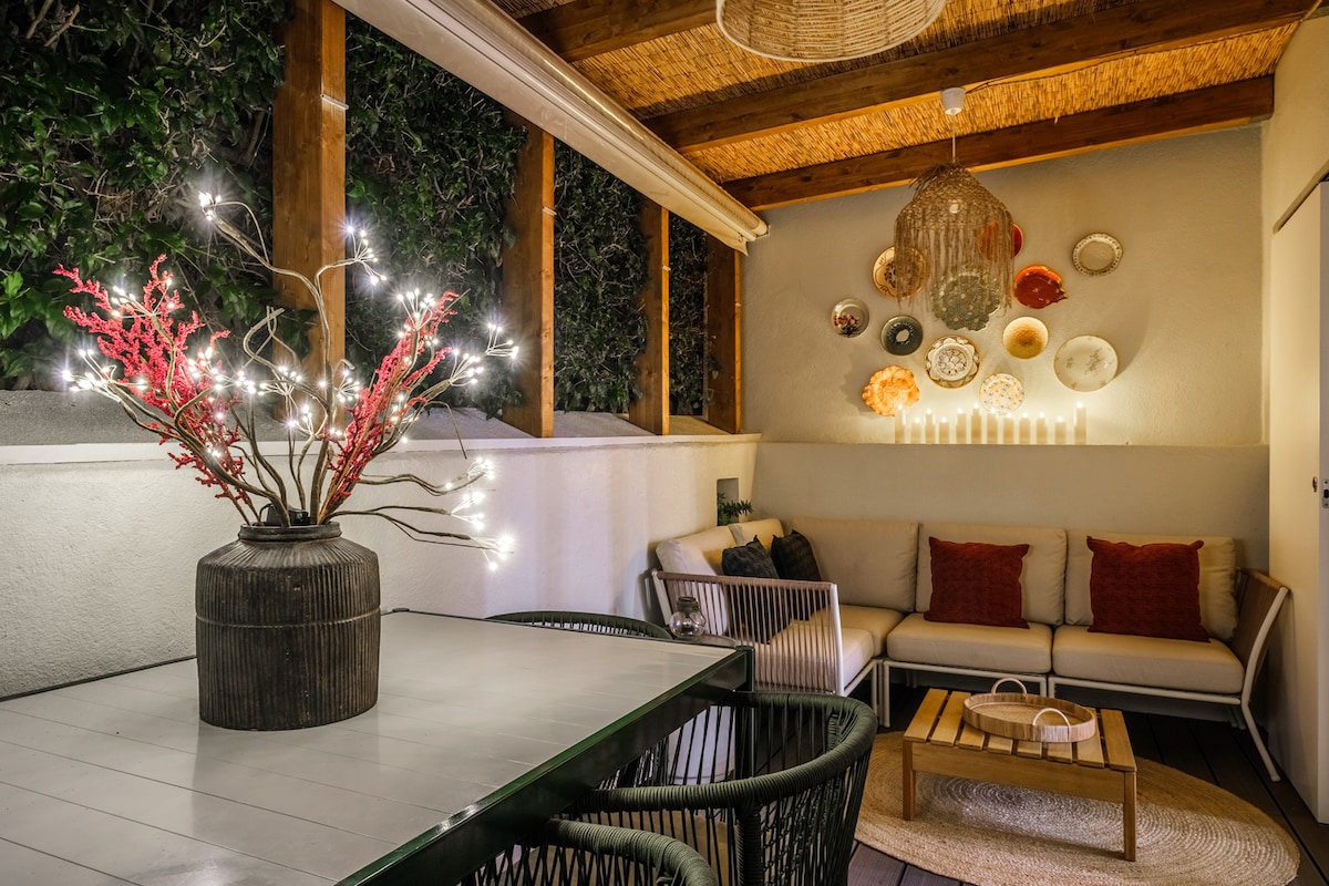 The Pool Pavilion is a cosy and relaxed two suites and kitchen space that overlooks a lush garden and is the ideal choice for a joyful and relaxing getaway. Appointed to a high standard with simple yet sophisticated materials, such as micro cement flooring , stucco walls and linen curtains, and decorated in soothing natural colours, it blends harmoniously with its surroundings. Large patio doors lead out onto a spacious, private garden with wood decking, a heated pool, sun loungers and table.